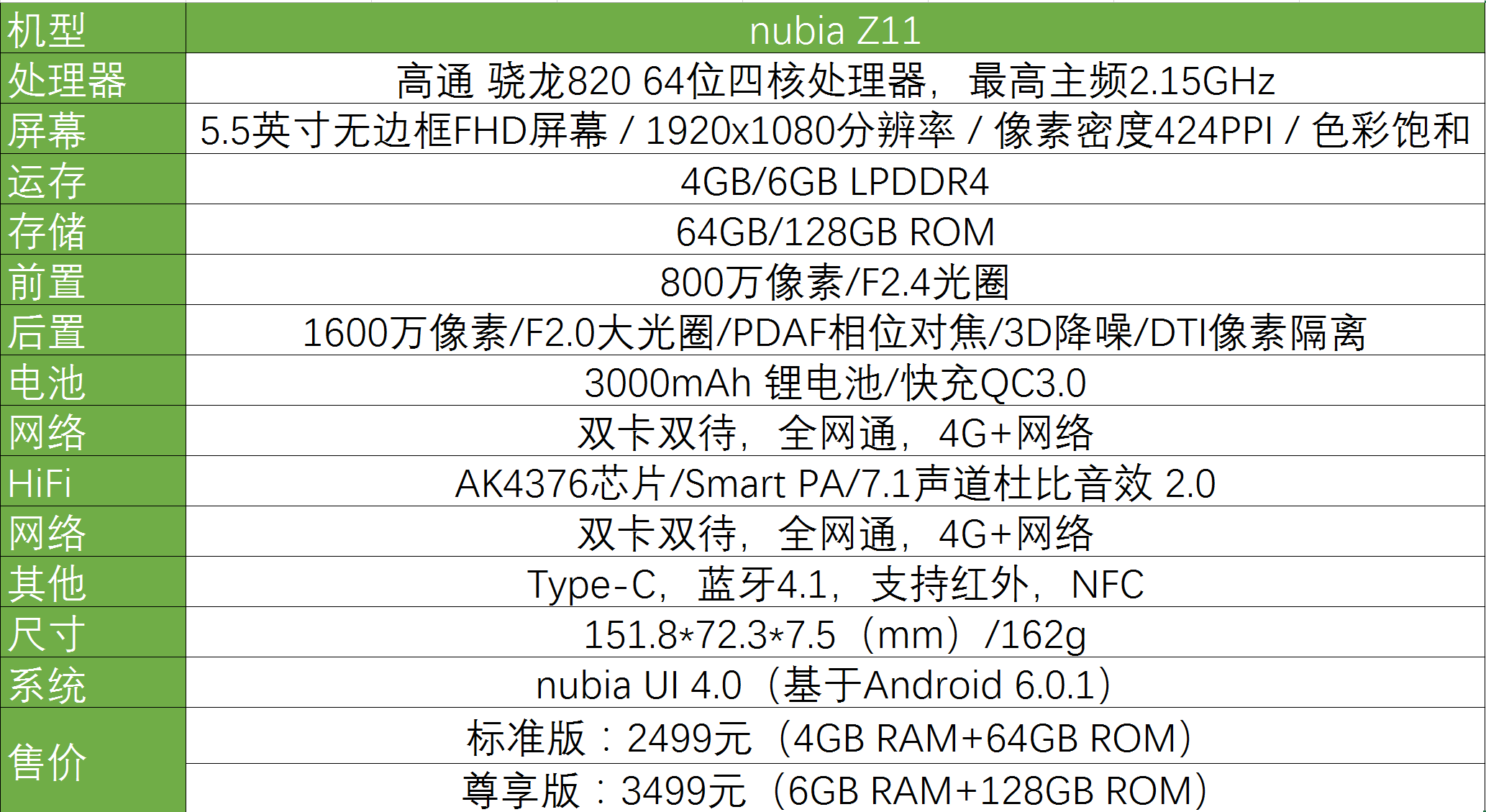 努比亞Z系列在今年已經(jīng)先后發(fā)布了多款手機(jī),但我認(rèn)為nubia Z11才是其中當(dāng)之無愧的真旗艦,首先nubia Z11的硬件達(dá)到了目前安卓手機(jī)的頂配,高通驍龍820處理器,4GB RAM+64GB ROM內(nèi)存組合,5.5英寸1080P分辨率,800萬像素前置攝像頭+1600萬像素主攝像頭,3000mAh電池,相比nubia Z9有著巨幅的提升。