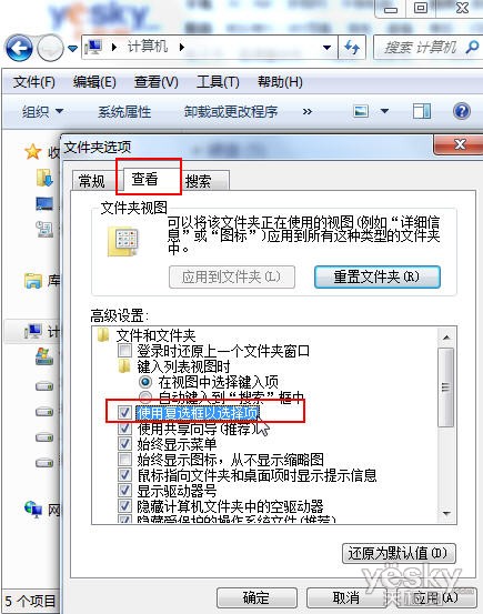 圖示:在“查看”選項卡中 勾選“使用復(fù)選框以選擇項” 電腦常識