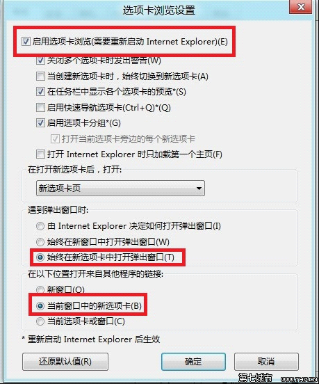 4、在打開的選項卡瀏覽設置界面中,勾選中“啟用選項卡瀏覽”、“始終在新選項卡中打開彈出窗口”、“當前窗口中的新選項卡”這三項,并確定。