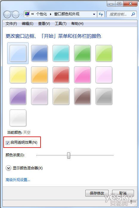 在這里,我們可以自己設置喜歡的窗口邊框、開始菜單和任務欄的顏色,并且可以調整色彩濃度。最重要的是,這里有一個選項“啟用透明效果”,仔細檢查是否勾選了這個選項。