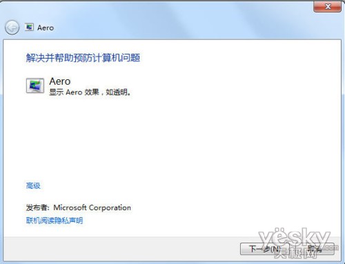 如果勾選了“啟用透明效果”,仍然看不到Aero特效,就在剛才的開始菜單搜索欄中選擇“查找和解決Aero及其他視覺效果的問題”。在這里點擊“下一步”,Windows7系統便會自動查找并解決問題。