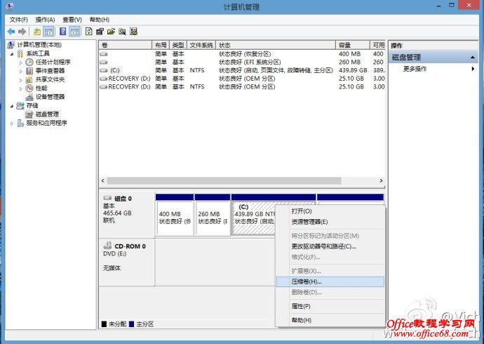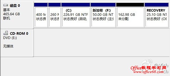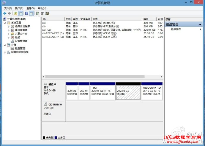 首先來看預裝window8系統的磁盤分區,一般是一個系統盤和一個系統恢復盤。我們需要把C盤減小,然后騰出空間做為其他分區。