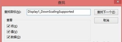 在彈出的注冊表界面,敲擊F3,在查找目標中輸入:Display1_DownScalingSupported,點查找下一個;