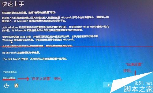 在如圖的頁面里,簡單的點擊“使用快速設(shè)置”按鈕省時省力,但是使共享語音、輸入、聯(lián)系人、日歷、地點和廣告 ID 等信息成為可能。如果在意這些信息的安全性,那就點擊左邊的“自定義設(shè)置”(字比較小,所有必須有但又不愿讓你看見的內(nèi)容,都這德性)。