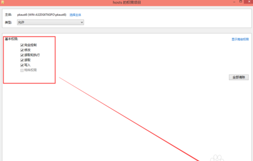 將hosts的權限項目界面下的基本權限的所以項目都勾選上,然后點擊確定,如下圖所示。