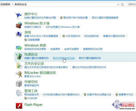 進入“系統和安全”分類,點擊“電源選項”一欄的“更改電源按鈕的功能”;