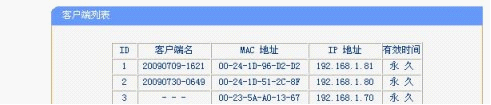 選擇客戶端列表就可以顯示出當前通過路由器連接的本地網(wǎng)絡(luò)的主機的名稱。客戶端主機的MAC地址,和分配給他們的IP地址,和其剩余的IP地址的使用時間。因為DHCP服務(wù)器涉及到一些專業(yè)的計算機知識,就不詳細的解釋,不過這個功能是非常的有用可以省去了設(shè)置IP協(xié)議的麻煩。