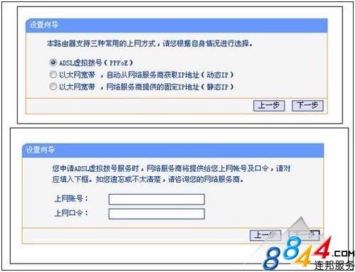 2.如果通過ASDL撥號上網(wǎng)用戶選擇“PPPoE”來進(jìn)行下一步設(shè)置。局域網(wǎng)內(nèi)或其它特殊網(wǎng)絡(luò)連接(如視訊寬帶、通過其它電腦上網(wǎng)之類)可以選擇以下兩項“以太網(wǎng)寬帶”來進(jìn)行下一步設(shè)置。ADSL撥號上網(wǎng)設(shè)置下兩項在后面都將會進(jìn)行說明。ADSL撥號上網(wǎng)的帳號和口令輸入界面,按向?qū)Ы缑娴奶崾据斎氡仨毜男畔ⅲ缬脩粼诰W(wǎng)絡(luò)服務(wù)提供商所提供的“上網(wǎng)帳號”和“密碼”然后按下一步。