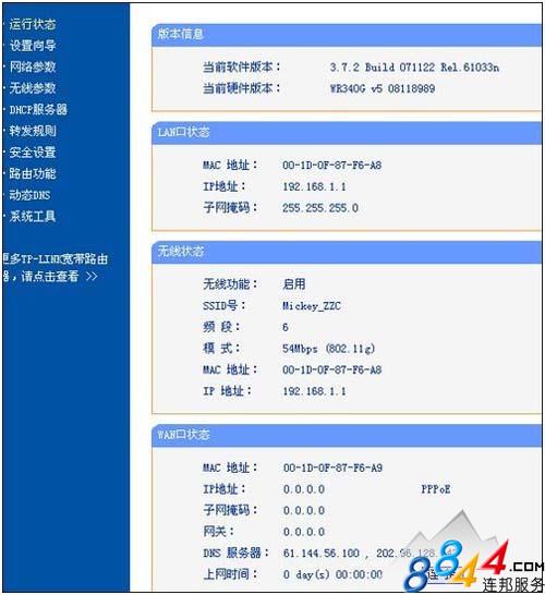 首先這里是第一個選項運行狀態(tài)。剛才我們對TP-LINK無線路由的設(shè)置都反映在上面,如果你是ADSL撥號上網(wǎng)用戶你在這里的頁面按連接就可以直接連上網(wǎng)絡(luò),如果你是以太網(wǎng)寬帶用戶則通過動態(tài)IP或固定IP連接上網(wǎng),這里也會出現(xiàn)相應(yīng)的信息。