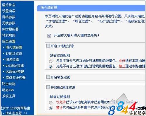 在安全設(shè)置的第一項(xiàng)防火墻設(shè)置內(nèi)我們可以選擇開啟一些防火墻功能“IP地址過濾”、“域名過濾”、“MAC地址過濾”、“高級安全設(shè)置”。開啟了以后使之后的各類安全功能設(shè)置生效。