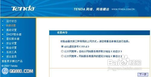 第三步:進入設置界面,點選“快速設置”,然后選者“ADSL虛擬撥號(PPPoE)”會出現如下的界面,點擊下一步