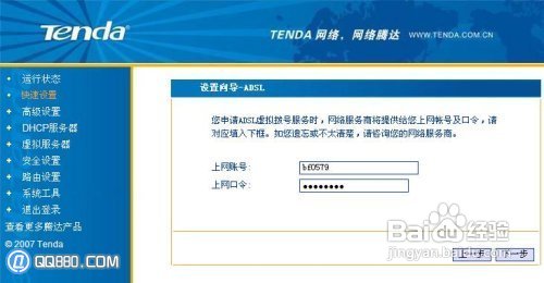 第四步:設置向導-ADSL,這里要求你輸入上網用戶名和密碼,填完之后點選下一步