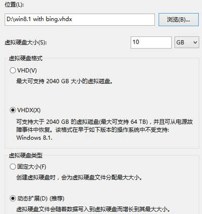 2、首先指定虛擬磁盤位置,例如創(chuàng)建一項win8.1 with bing.VHDX磁盤(優(yōu)先選擇VHDX格式);至于VHD大小自行決定,因為是32位系統(tǒng),我們可以選擇10G大小,推薦創(chuàng)建動態(tài)擴展;