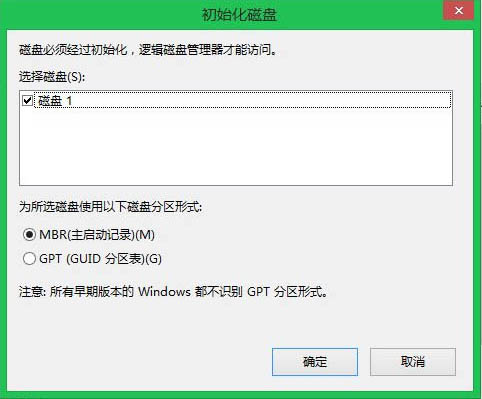 3、對剛才的win8.1 with Bing虛擬磁盤初始化,根據(jù)自己電腦是否使用傳統(tǒng)BiOS或UEFI引導(dǎo),分別創(chuàng)建MBR主啟動記錄或GPT分區(qū);