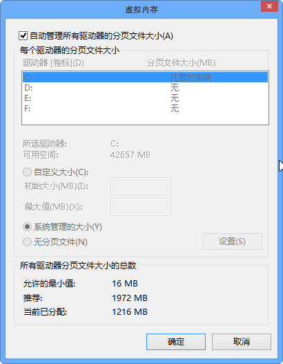 5. 下面圖一是沒有經過設置的虛擬內存,如果要設置的話,就先將“自動管理所有驅動器的分頁文件大小”前面的勾取消,然后選擇D盤---自定義大小,輸入最小值和最大值(虛擬內存設置的原則是:虛擬內存最小值是物理內存的1到1.5倍;虛擬內存最大值是物理內存的2到2.5倍。)