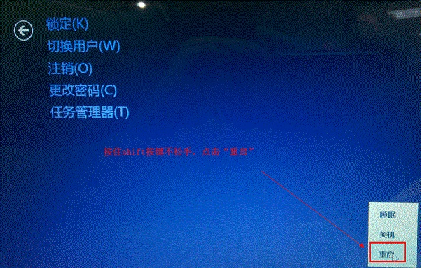 2. 按住鍵盤Shift按鍵不要松手,鼠標(biāo)點(diǎn)擊“重啟”快速進(jìn)入修復(fù)界面;
