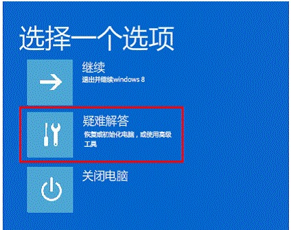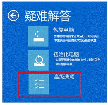 3. 將看到恢復(fù)界面,選擇“高級回復(fù)選項(xiàng)”---“疑難解答”;