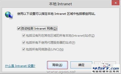 2、進(jìn)入本地Internet之后,再單擊【高級】按鈕;