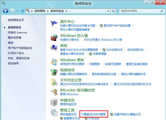 2、進入系統和安全界面,點擊“對硬盤進行碎片整理”。如下圖所示: