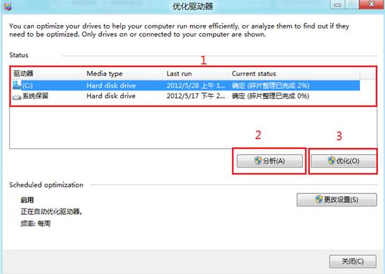 3、選中驅動器,點擊“分析”按鈕,分析完畢后點擊“優化”按鈕,完成后即可完成磁盤碎片整理。如下圖所示:
