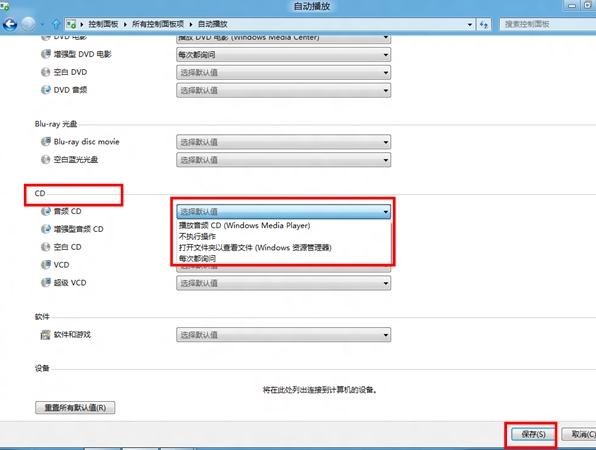 2、在“自動播放”窗口中,根據自己的需要(以圖中CD為例),選擇相應的設置,點擊“保存”即可。