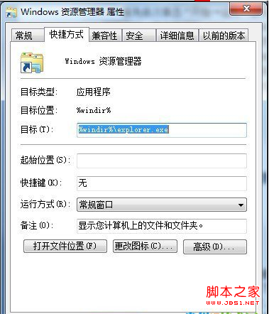 其次切換到“快捷方式”標簽設置頁面,在該頁面的目標文本框中輸入“%windir%explorer.exe”字符串內容,再單擊“確定”按鈕保存設置操作,這樣Win 7系統就能直接打開磁盤分區窗口,而很少發生假死現象。