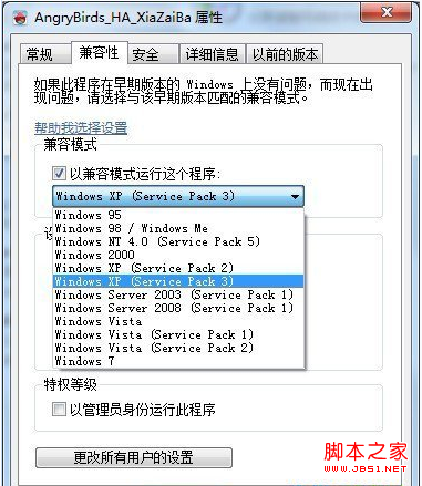 其次,點選“兼容性”標簽,打開如圖4所示的標簽設置頁面,選中“以兼容性模式運行這個程序”選項,同時從該選項的下拉列表中選中 “Windows XP(Service Pack3)”,再按“確定”保存設置。這樣我們以后再次運行相同的應用程序時,Win 7系統就不大容易發生假死現象了。