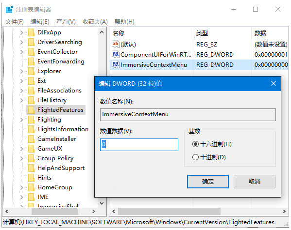 3、在右邊新建Dword(32位)值,重命名為ImmersiveContextMenu,數值數據直接使用默認的“0”,不必修改,如下圖——