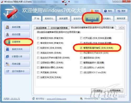 這里說的優化工具有很多種,一般支持WindowsVista的優化工具,都能用來優化WIndows7,比如Vista優化大師(進入下載),Vista總管(進入 下載)等,當然那些專門設計給Windows7的優化軟件也可以達到一樣的效果,比如Windows7優化大師(進入下載)、Windows7總管等等。這些工具中的系統設置中,右鍵設置都有 添加獲得管理員權限的功能,這里就不詳細說明了,大家自己找一下即可。