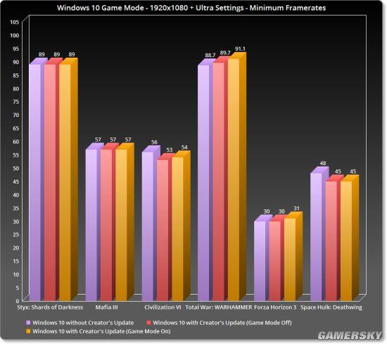 紫條:未進(jìn)行創(chuàng)意者更新的Win 10,紅條:更新后(游戲模式關(guān)閉),黃條:更新后開啟游戲模式