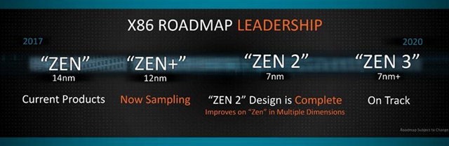 2019年是7nm Zen 2,直接跨越10nm工藝而進入下一個節(jié)點,同時整個架構全面升級,躍升一個檔次,現(xiàn)已順利試產(chǎn)。