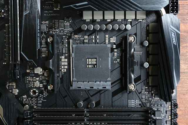 銳龍二代搭配的主板是華碩最新款ROG玩家國度的頂級作品Crosshair VII Hero (WiFi),相比前代X370 Crosshair VI Hero供電區(qū)域增大了金屬散熱片的覆蓋面積,并利用表面溝槽進(jìn)一步擴(kuò)大散熱面積,同時內(nèi)存插槽變成帶金屬扣的加固式,CPU下方的PCI-E x1接口換成M.2接口并輔以散熱片,背部還增加了一個PS/2接口方便操作,也提供非Wi-Fi版本。