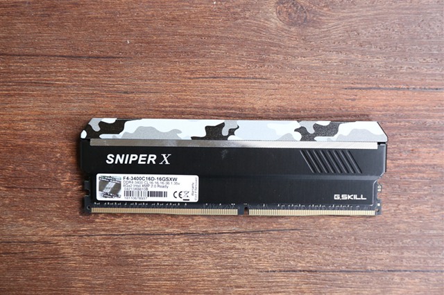 內(nèi)存采用芝奇的兩條Sniper X,迷彩馬甲設(shè)計,單條容量8GB,頻率可以運行在3400MHz,實際測試中頻率設(shè)定為2933/2900MHz,時序16-16-16-36,電壓1.35V。