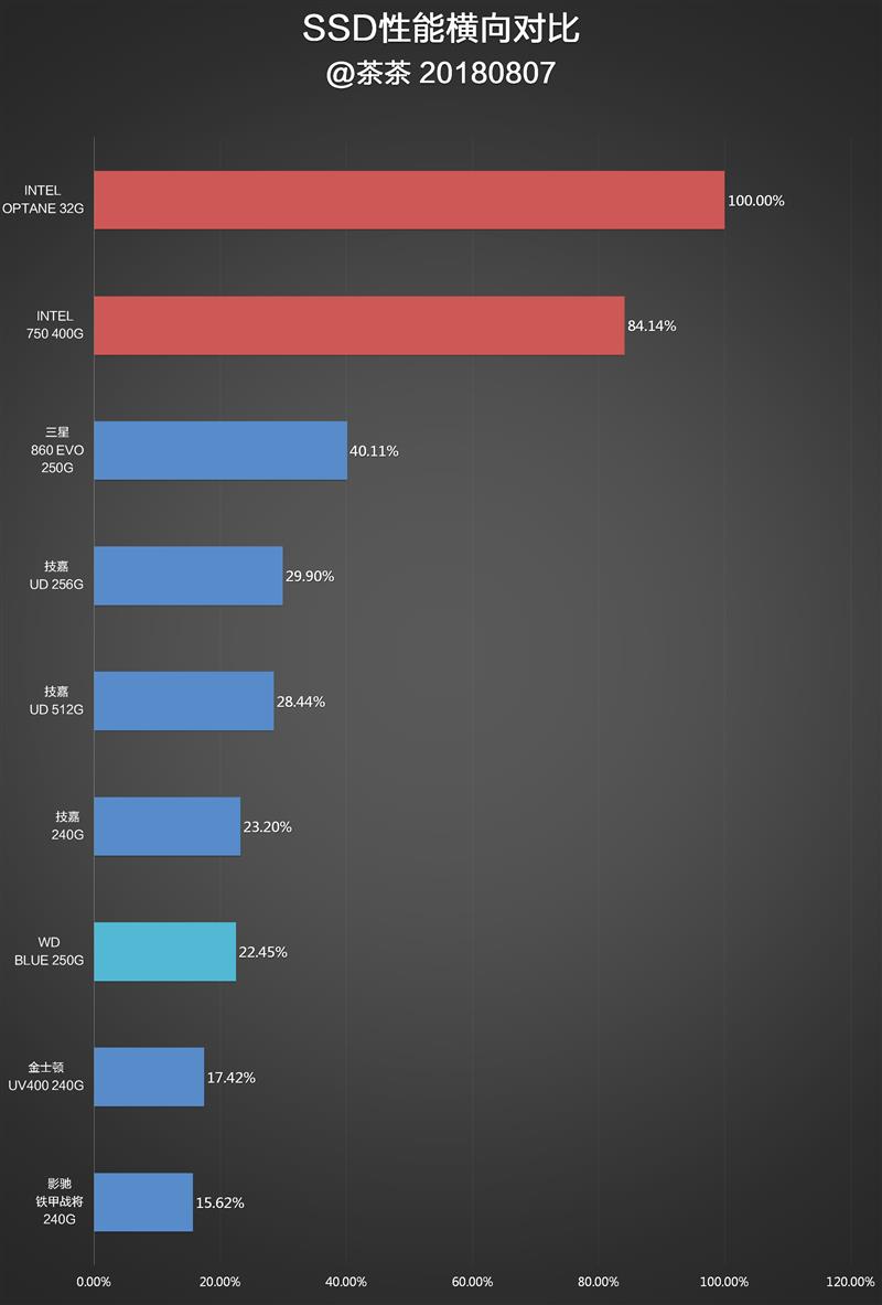 以下為橫向統計的圖表,相對于其他的SATA SSD來說,西數藍盤的性能不算特別好,與無緩存的技嘉240G相當,大致就是群聯無緩存方案SSD中偏好一些的水準。