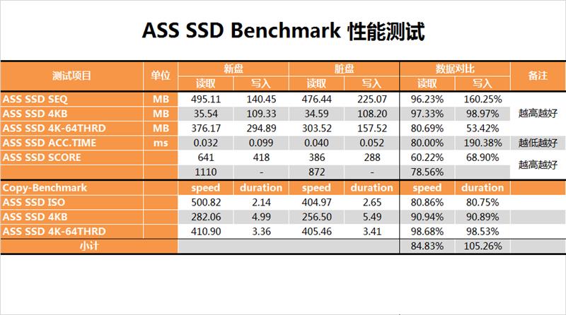 然后看一下不同測試軟件的跑分情況,AS SSD是1110\872,性能變化還是比較大的。