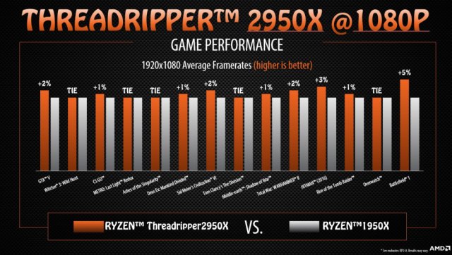 最后附上官方對于2950X相對于1950X性能提升的游戲參考,基本上完全相同的顯卡和平臺配置,2950X會與1950X持平或者提升微弱。所以說如果是玩游戲的話,其實糾結于1950X還是新的2950X意義不大。