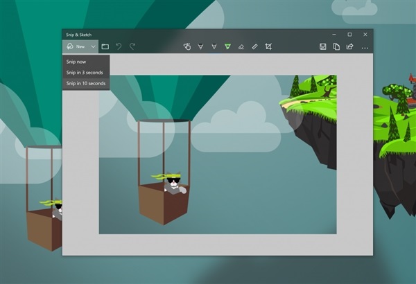 新的截圖應用叫做SNIP & SKETCH(或Screen Sketch),本版修復了延時截圖的BUG,在“新建”的下拉菜單中可以點擊3秒/10秒后截圖。
