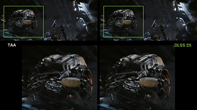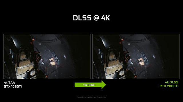 比如根據官方數據,Epic的《滲透者》(Infiltrator)游戲里,4K分辨率下1080 Ti開啟TAA平均幀率還不到40FPS,2080 Ti開啟DLSS則能達到80FPS,提升了整整一倍!