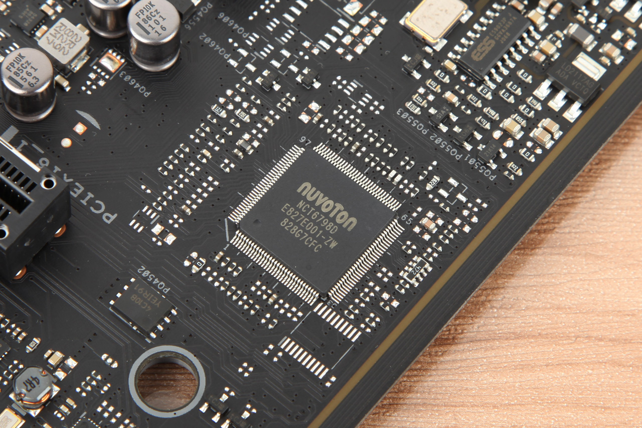 PCIe接口左側的黑色芯片則是I/O面板芯片,來自NUVOTON,型號為NCT6798D。