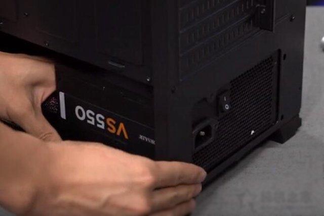 由于我們這款機箱是下置電源,我們安裝電源的時候,將電源的風扇的位置往下進行安裝,如下圖所示。