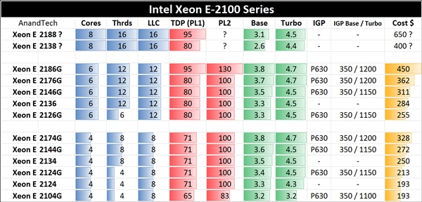 Anandtech的猜測是,ES1預(yù)計(jì)命名Xeon E-2138,ES2預(yù)計(jì)命名Xeon E-2188,價(jià)格分別是400美元和650美元左右。