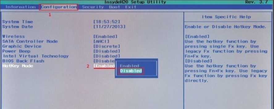3、進入BIOS里面后,在BIOS 設置程序中,打開Configuration(配置)菜單,然后將HotKey Mode (熱鍵模式)的設置從Enabled (啟用)改變為Disabled (停用)。