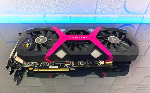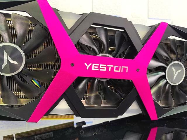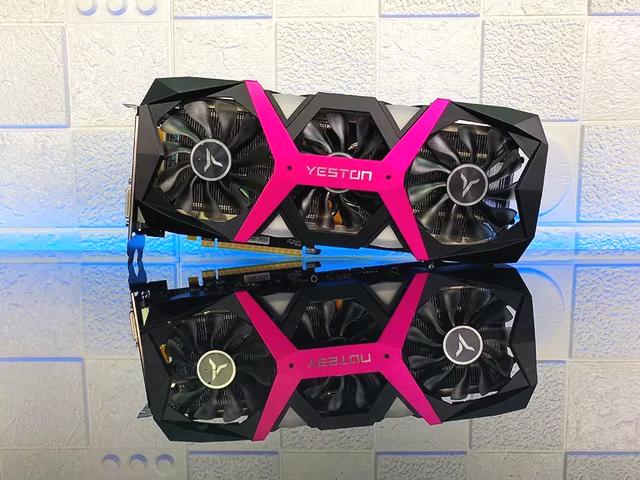 比如說盈通的這款非公RX590,非常騷氣的“女裝大佬”散熱方案;非常大膽地采用了粉紅配色,視覺效果異常出彩。