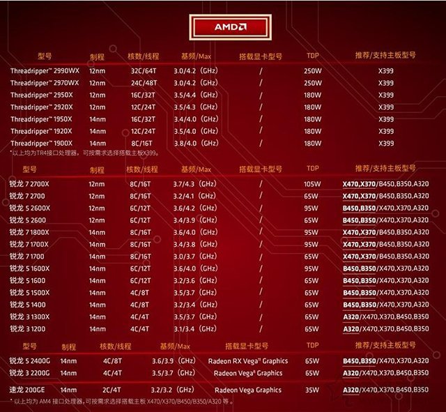 以下型號均為AMD銳龍第二代系列處理器,AMD銳龍二代CPU和主板搭配對照表如下: