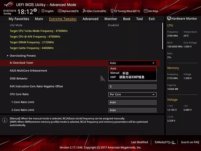 這時已經進入了BIOS高級模式,在“Extreme Tweaker”選項卡中,進入超頻選項,選擇“ai overclock tuner”,出現三個選項,第一個為AUTO,第二個為手動,第三個則是我們即將選擇的XMP。