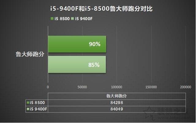 魯大師跑分結(jié)果,i5-9400F跑了84049分,而i5-8500跑了84298分,兩者差了200分左右,i5-8500小勝,不過(guò)差距極小,完全可以忽略不計(jì)。