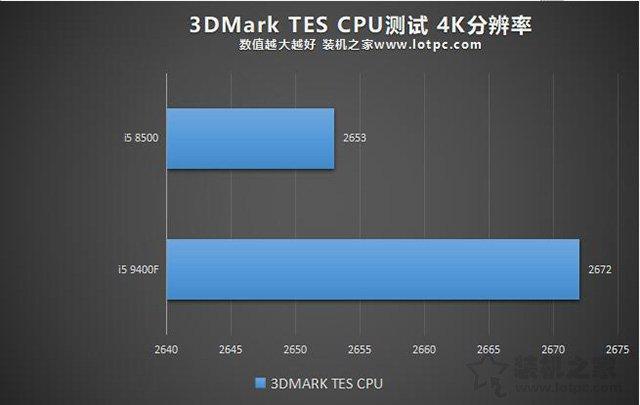 3DMARK TES CPU測(cè)試,4K分辨率下,i5-9400F跑分2672,i5-8500跑分2653,i5-9400F小勝,性能提升也是可以忽略不計(jì)的。