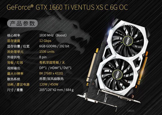 GTX1660Ti的性能大致相當(dāng)于上一代GTX1070,相比GTX1660提升了約10%左右,也就是說(shuō),目前市面上大多數(shù)游戲都可以滿足了。微星GTX 1660 Ti VENTUS XS C 6G OC 6G萬(wàn)圖師顯卡的核心采用Turing架構(gòu)的TU116,內(nèi)建1536個(gè)流處理器,同時(shí)搭配192-bit位寬的6GB GDDR6顯存,顯存頻率達(dá)12000MHz,核心頻率達(dá)1530-1830MHz。擁有三個(gè)顯示接口,分別是1個(gè)DP接口、1個(gè)HDMI接口、1個(gè)DVI-D接口。