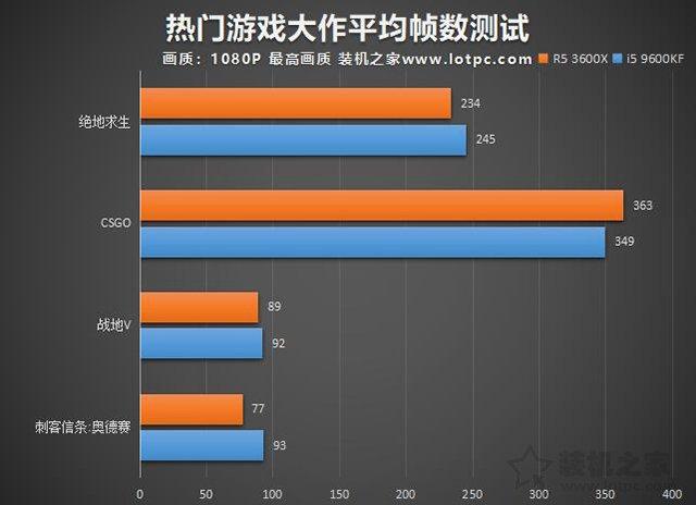 在1080P最高畫質中,intel酷睿i5-9600KF依然占據較大的優勢,在《GTA5》、《戰地V》、《刺客信條:奧德賽》中,平均幀數領先了3-16幀的成績,只有CSGO這款游戲,AMD銳龍R5 3600X平均幀數領先了14幀,這也是AMD比較強調比較優勢的項目。