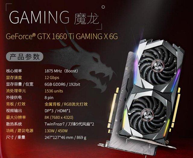 GTX1660Ti相當于GTX1660升級版,也可以稱之為加強版,性能提升了差不多10%左右,性能大致相當于上一代GTX1070,爽玩大多數(shù)游戲大作。裝機之家推薦的是全新發(fā)布的微星 魔龍 GTX 1660 Ti GAMING X 6G顯卡,一線性價比品牌,刀鋒5雙風扇散熱,采用了12nm工藝的TU116核心圖靈架構(gòu),搭載了1536個流處理器,采用了6GB/192Bit 全新GDDR6顯存,Boost核心頻率為1875MHz,顯存頻率達12000MHz。